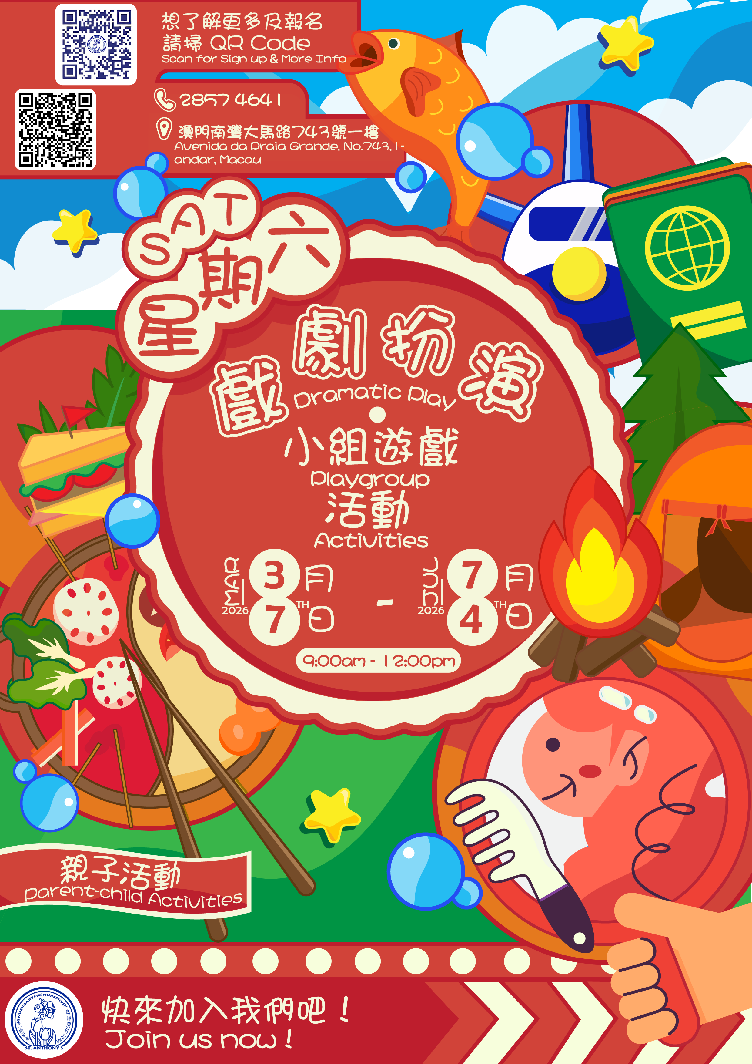 歡迎來到聖安東尼Playgroup!遊戲是孩子成長過程中重要的一環,能深入探索他們的想像力與創造力世界。透過「戲劇扮演遊戲」,我們為孩子提供在主題遊戲中觀察真實世界的機會,讓他們扮演生活中常見的各種角色。我們精心設計了十餘種主題場景,從在忙碌廚房中化身小廚師,到踏上野外露營的探險旅程!孩子最喜歡結伴遊戲,因此我們特別邀請家長前來共同參與!在團隊的專業引導下,我們的戲劇扮演遊戲不僅備齊了豐富道具與服裝讓孩子沉浸角色,更將帶領大家進入精心打造的遊戲中心,完全融入當日主題。