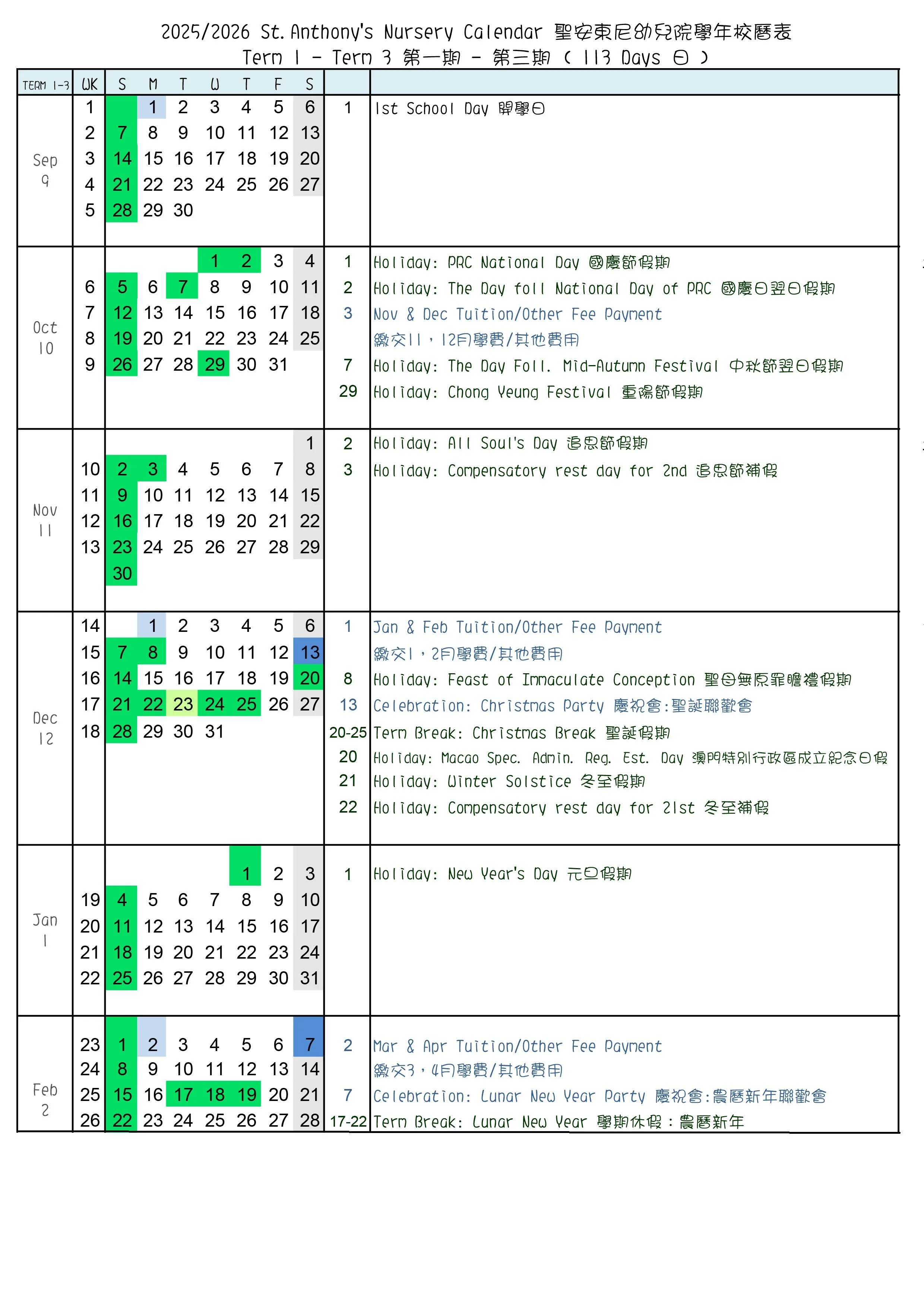 St. Anthony’s Nursery Calendar 聖安東尼幼兒院學年校曆表